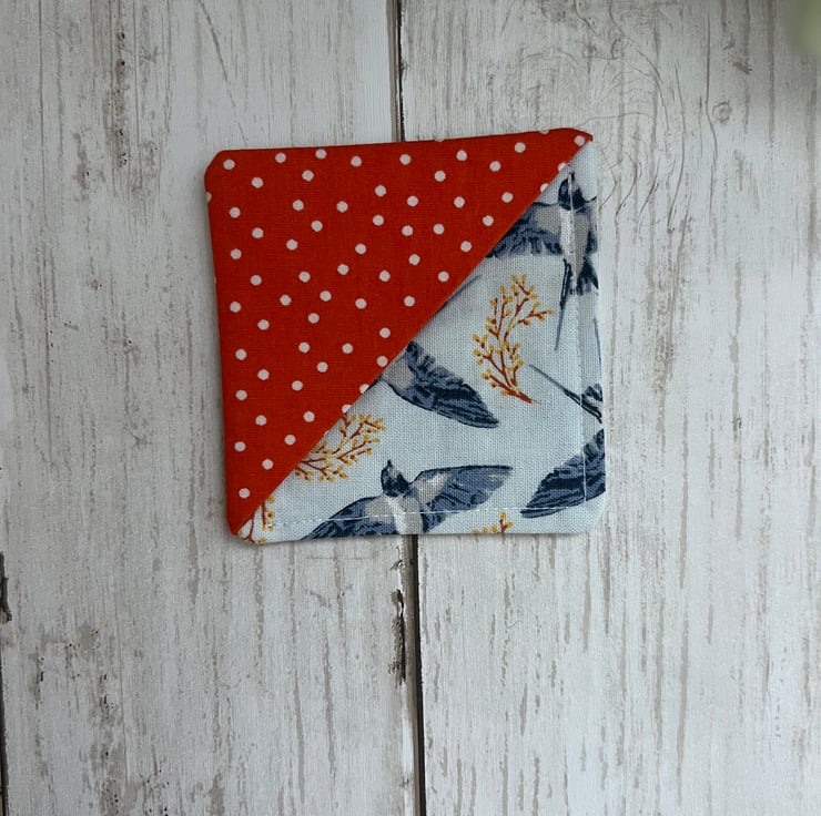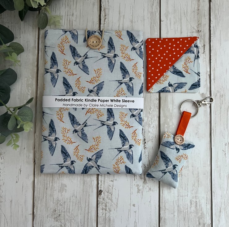 Made from 100% cotton fabric, these padded covers are made with two co-ordinating fabrics, the outer design is a lovely swallow fabric and the inner fabric s polka dot orange. They are gently padded with wadding and have two buttons either side with a co-ordinated elastic to keep your Kindle protected, especially useful whilst travelling, great for holidays, keeping it free from scratches in your bag.