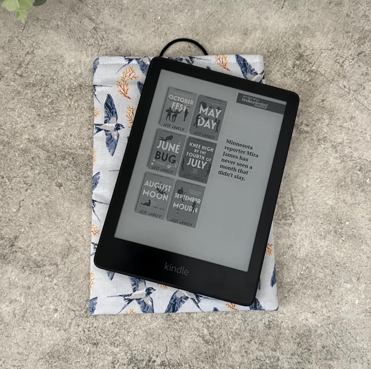Handmade gift set comprising of a padded Kindle Paper White protector cover, matching lavender filled key ring and corner bookmark presented in a gift box.