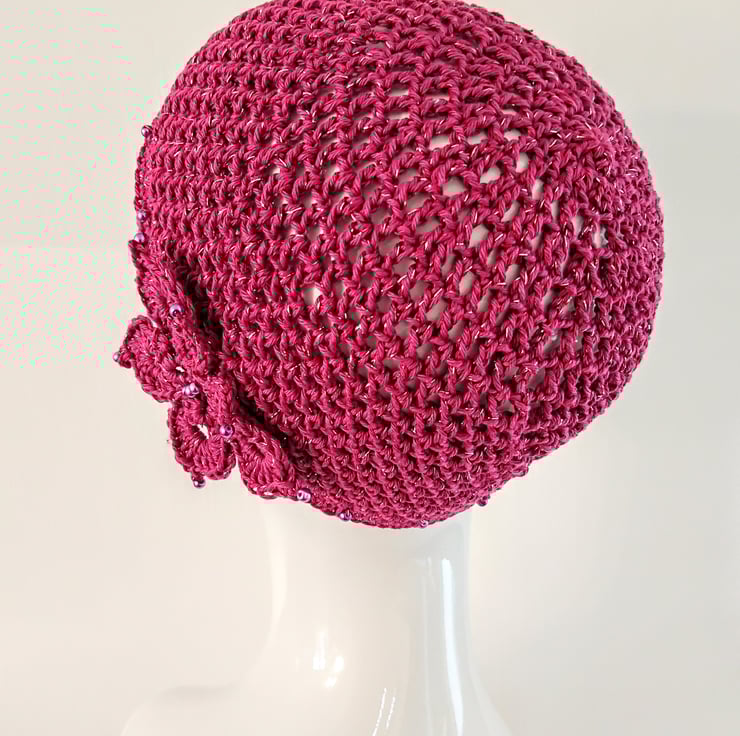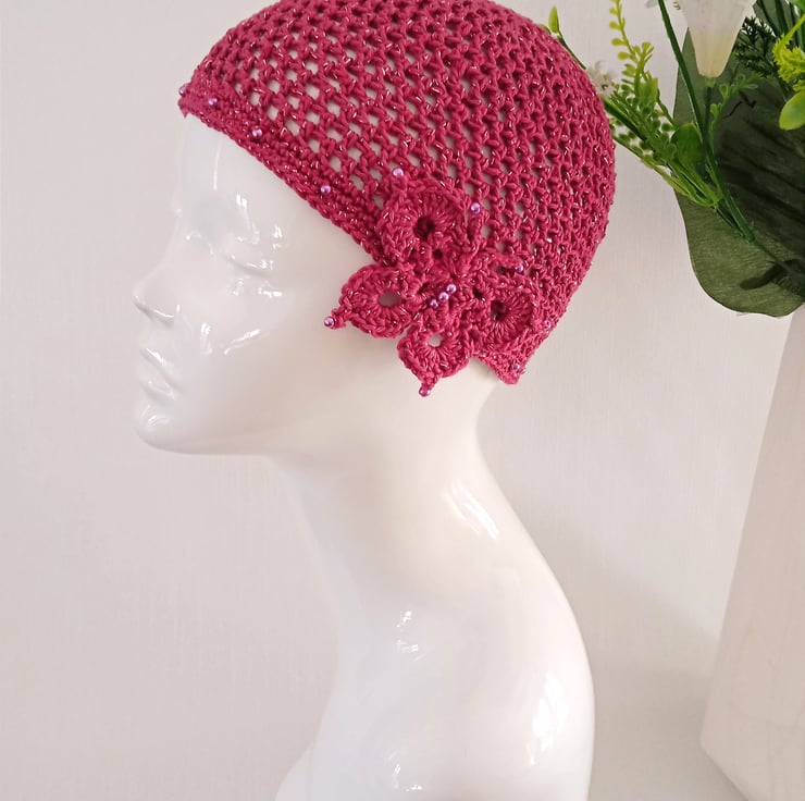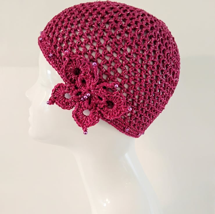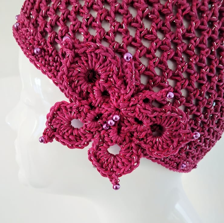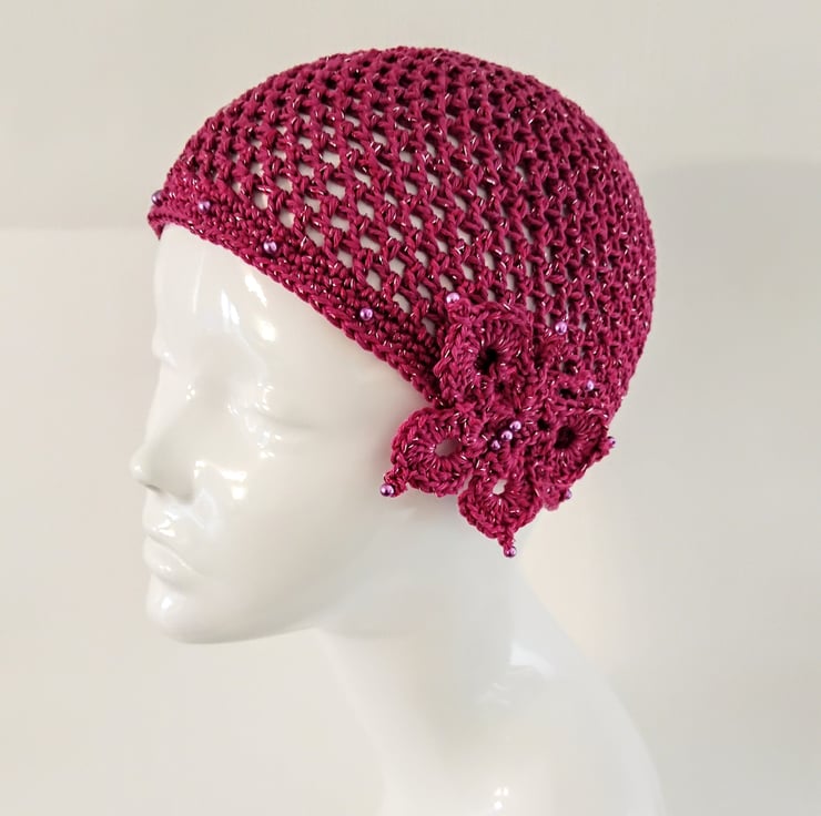 I have crocheted this skull cap with a fine pink cotton yarn combined with a pink and silver glitter thread. The hat is finished with matching glass pearl beads around the edge and the butterfly motif is on the side.