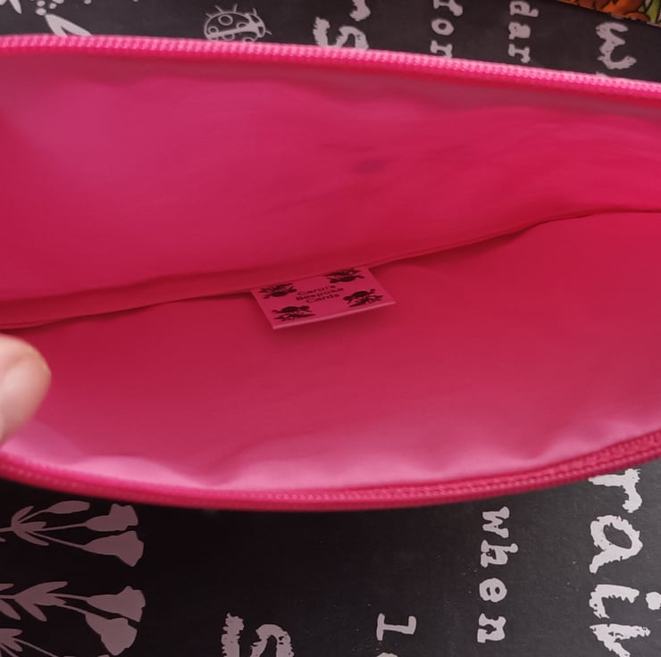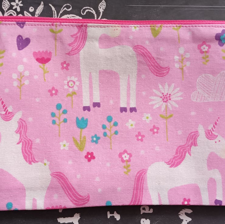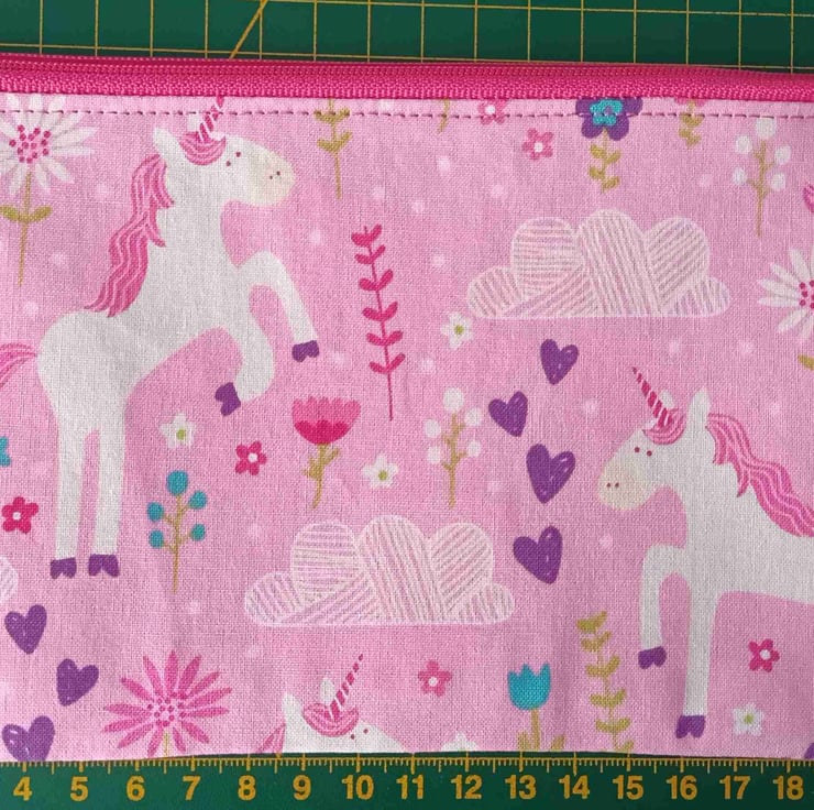 Pencil Case for a Unicorn Lover. A pretty white Unicorn and flowers in a mix of colours on a candy pink background, inside has a pink lining. 100% cotton with stabilizing fabric and fuchsia pink nylon zipper.