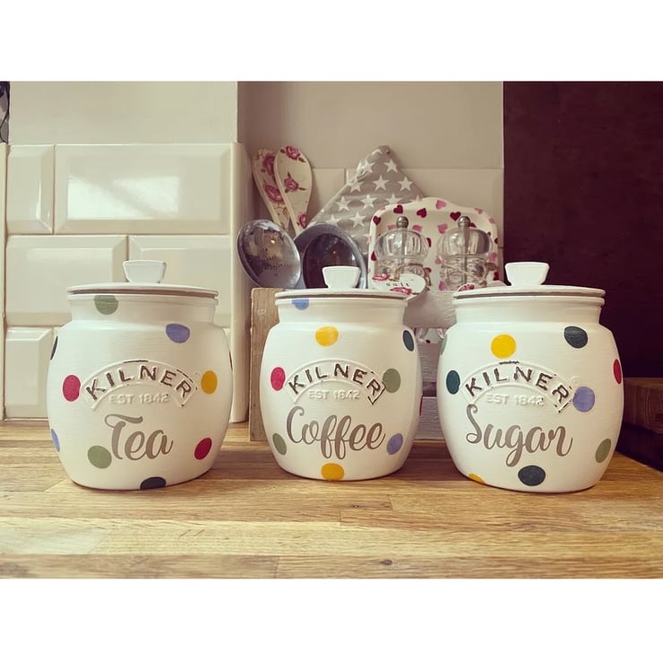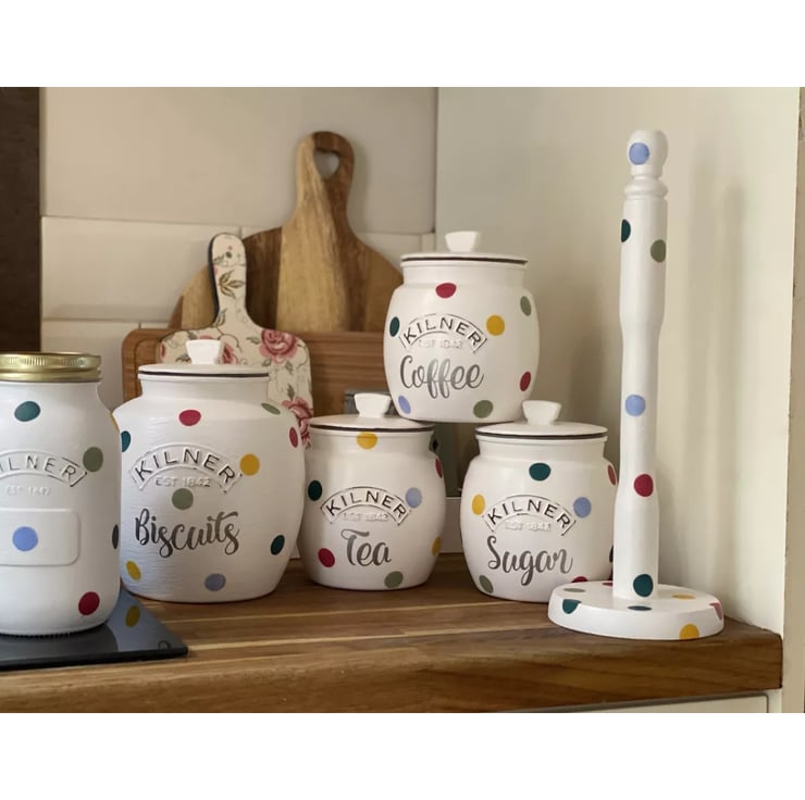 Emma Bridgewater Themed Kilner Jar set of 3 tea coffee and sugar canisters. In the polka dot design (biscuits jar, kitchen roll holder, etc sold separately)