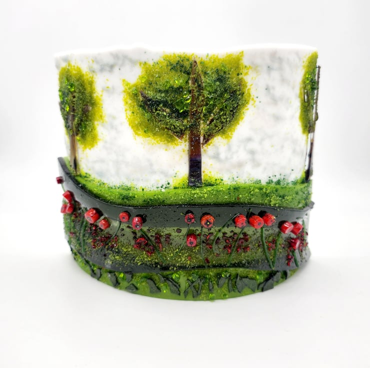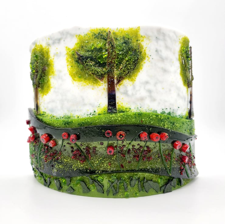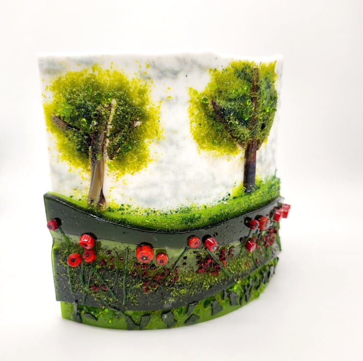 The scene measures 22cms wide and 14 cm in height.This handcrafted fused glass artwork portrays a scene of trees and a poppy field. It is created using hand-cut glass fused onto a white background, and it is enhanced with glass frit and poppy murrine. The layering and contour fusing of the glass produce intriguing textures and undulations. The artwork measures 22 cm in width and 14 cm in height.