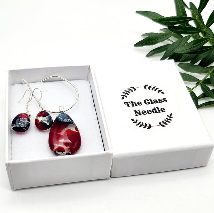 Fused glass teardrop necklace and earring set featuring deep red glass and silver foil, which has created a beautiful reaction within the glass.