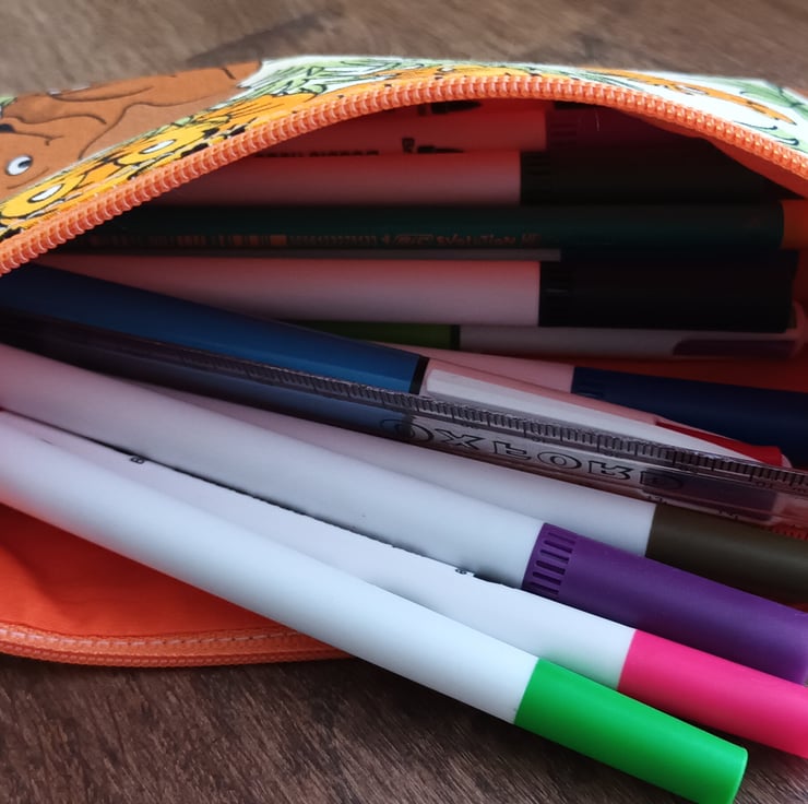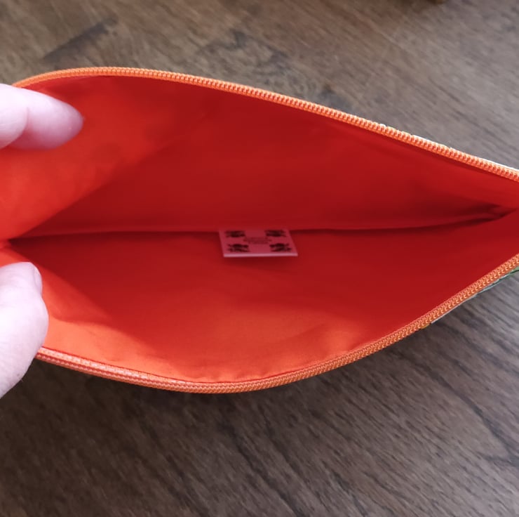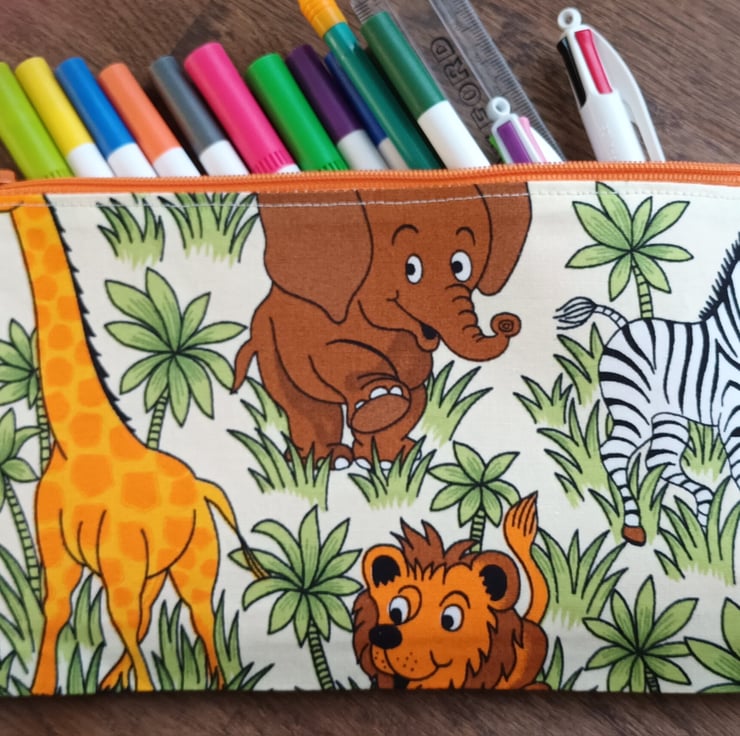 Jungle themed pencil case for a wild animal lover, with Tigers, Lions, Zebras, Hippos etc, and an orange lining. 100% cotton with stabilizing fabric and orange nylon zipper. Please note that the pens and pencils are NOT included and are for photographic purposes only. Pattern placement may vary.
