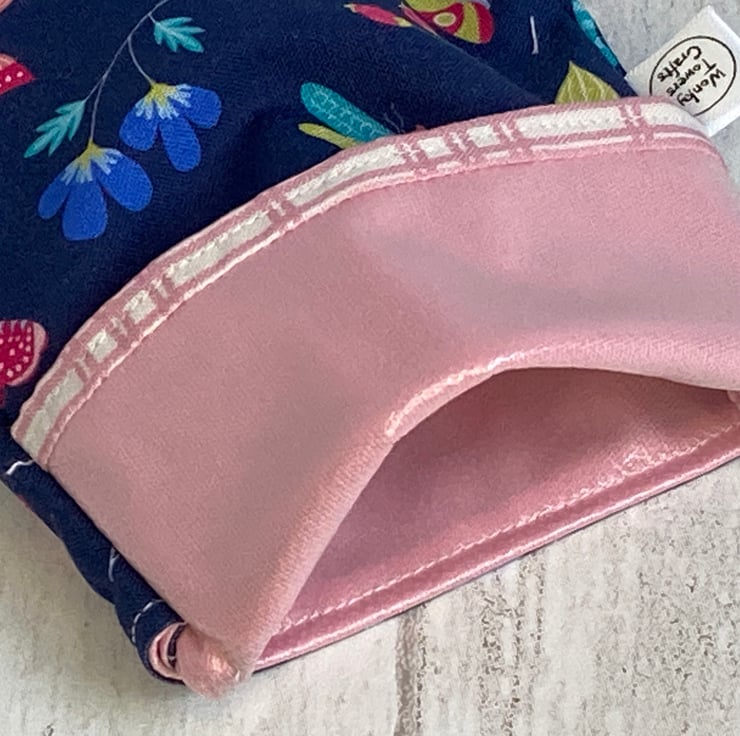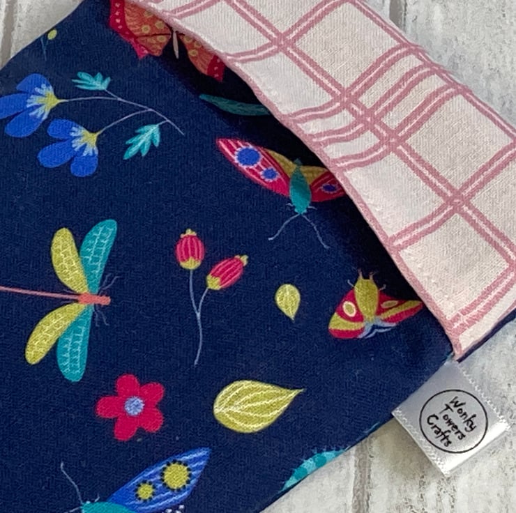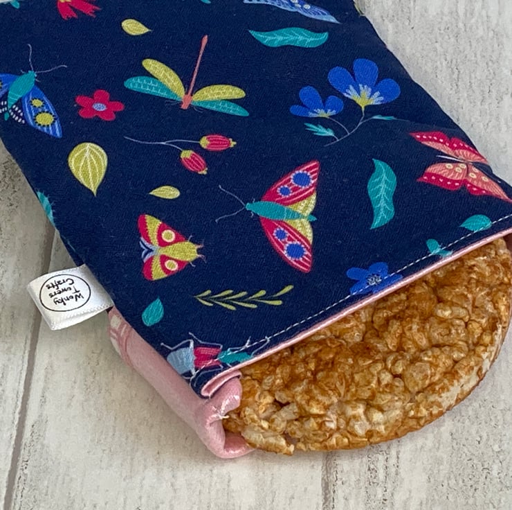 Snack bags measure approximately 11cm x 14cm. This one is made from a navy blue fabric decorated with insects and flowers. The fold-over flap is pink check and the lining is pink. It is made a bit like a pillowcase - a simple flap folds over and keeps your snack safely in the bag. There are no poppers or Velcro to catch crumbs and it’s easy to keep them clean and hygienic. So much easier than beeswax wraps! If you're not going out these bags are perfect for keeping small snacks fresh in the fridge.