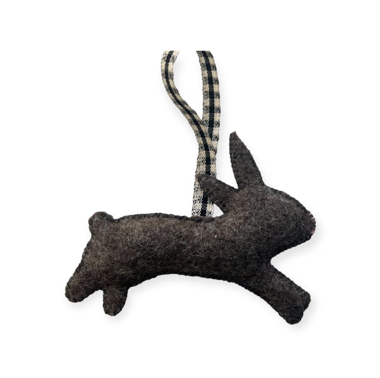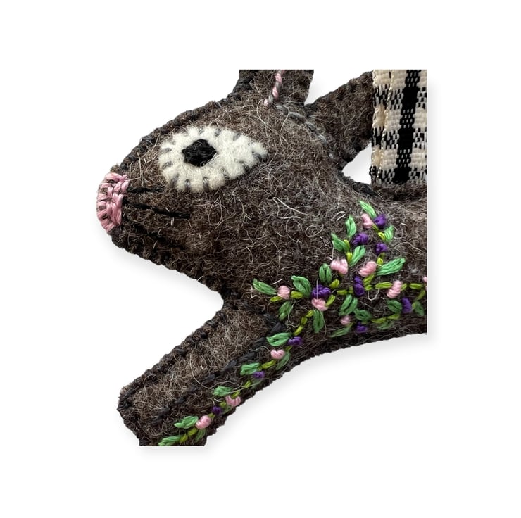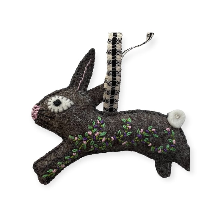 This grey wool felt hand embroidered felt rabbit has been hand embroidered with tiny pink flowers and has a black and cream checked ribbon hanger.