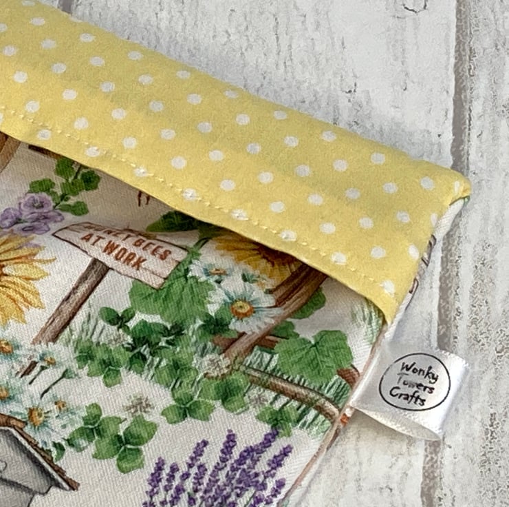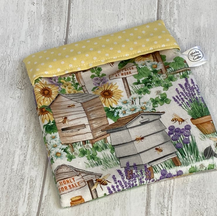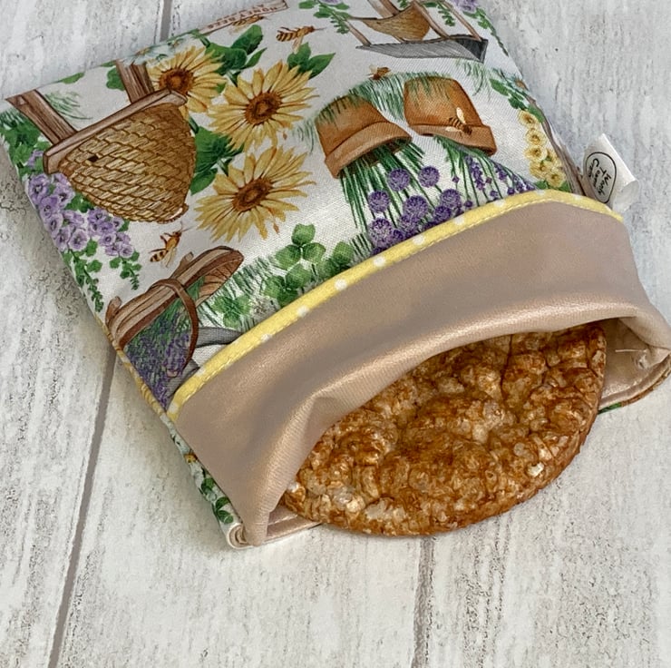 Snack bags measure approximately 12cm x 14cm. This one is made from a pretty fabric decorated with beehives and flowers. The lining is beige and the fold-over flap is yellow polka dot. It is made a bit like a pillowcase - a simple flap folds over and keeps your snack safely in the bag. There are no poppers or Velcro to catch crumbs and it’s easy to keep them clean and hygienic - great for storing small things in the fridge and for when you are out and about.