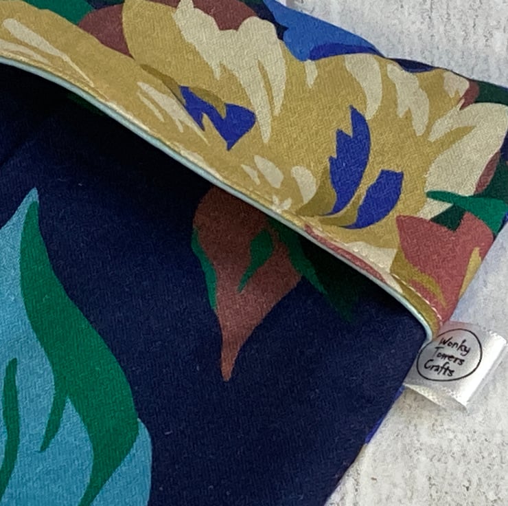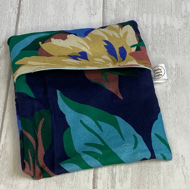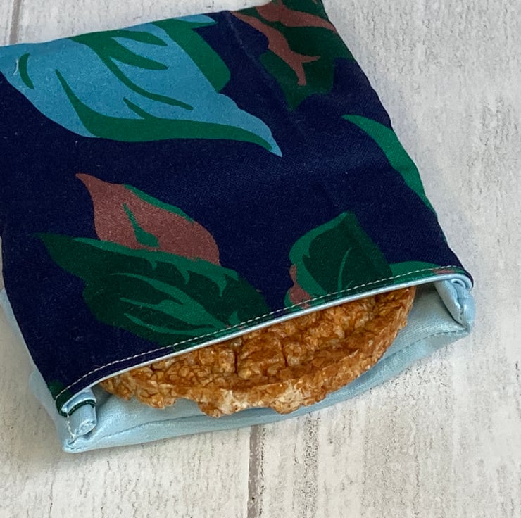Snack bags measure approximately 12cm x 14cm. This one is made from a navy blue fabric with an abstract floral design. The lining is pale blue. It is made a bit like a pillowcase - a simple flap folds over and keeps your snack safely in the bag. There are no poppers or Velcro to catch crumbs and it’s easy to keep them clean and hygienic - great for storing small things in the fridge and for when you are out and about. This one is listed as a 'second' as I have joined pieces of PUL to make the lining.