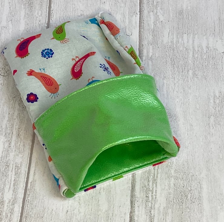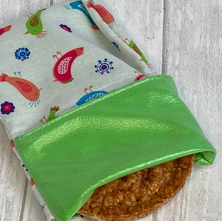 Snack bags measure approximately 11cm x 14cm. This one is made from a white fabric decorated with birds. The lining is green. It is made a bit like a pillowcase - a simple flap folds over and keeps your snack safely in the bag. There are no poppers or Velcro to catch crumbs and it’s easy to keep them clean and hygienic - great for storing small things in the fridge and for when you are out and about. This one is listed as a 'second' as I have joined pieces of PUL to make the lining.