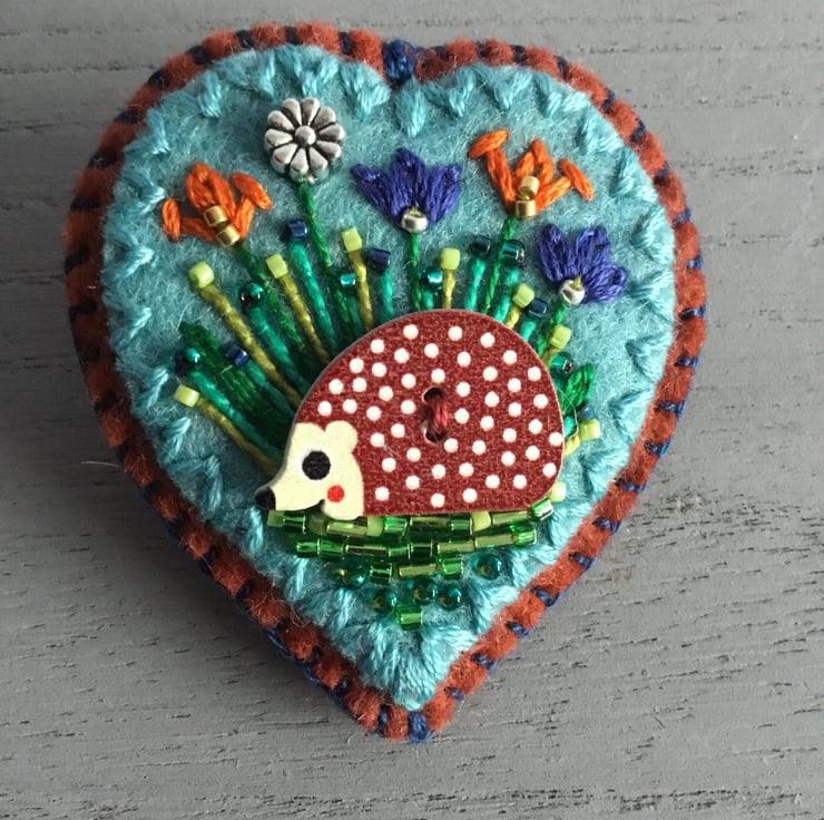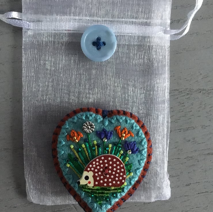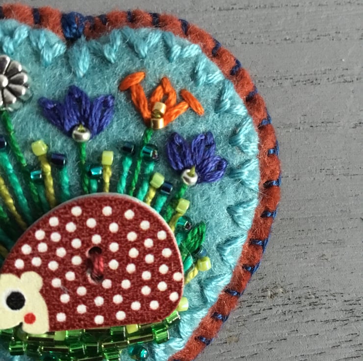 This Hand Embroidered Hedgehog Brooch is for someone who loves Hedgehogs…….reflected in the heart shaped Hedgehog embroidered scene. A Hedgehog button is sewn onto pale blue and terracotta brown felt heart shapes. She’s foraging through hand embroidered blue and orange flowers, a sliver flower button and green grasses, using Lazy Daisy and Straight Stitches in embroidery threads, with blue, green and golden seed beads….