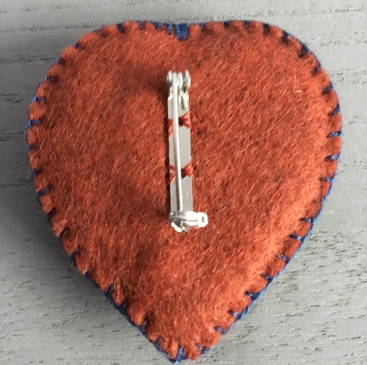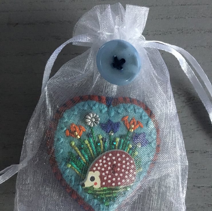 This heart shaped Hand Embroidered Hedgehog Brooch is 6 cms by 5 cms / 2 inches by 2.50 inches in size. A metal brooch pin with a safety catch for secure wear is sewn on the back. A nice wearable size to wear on a coat, jumper, cardigan or jacket.