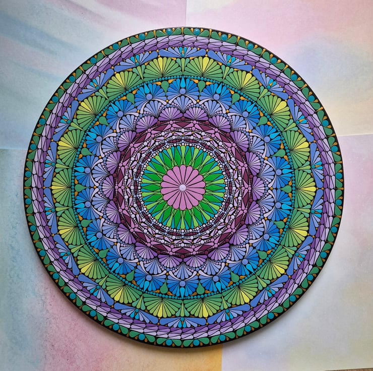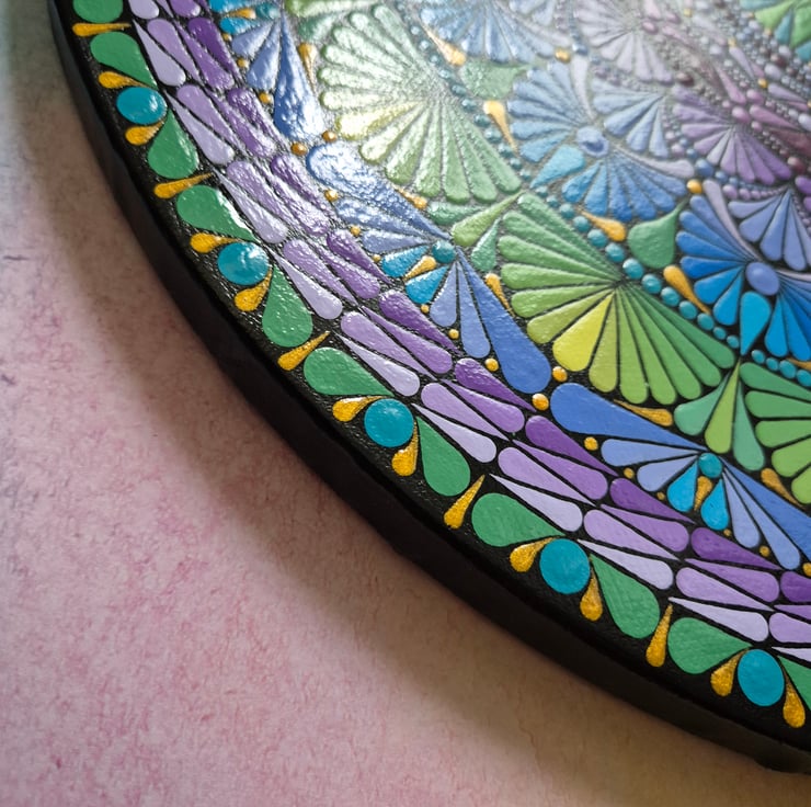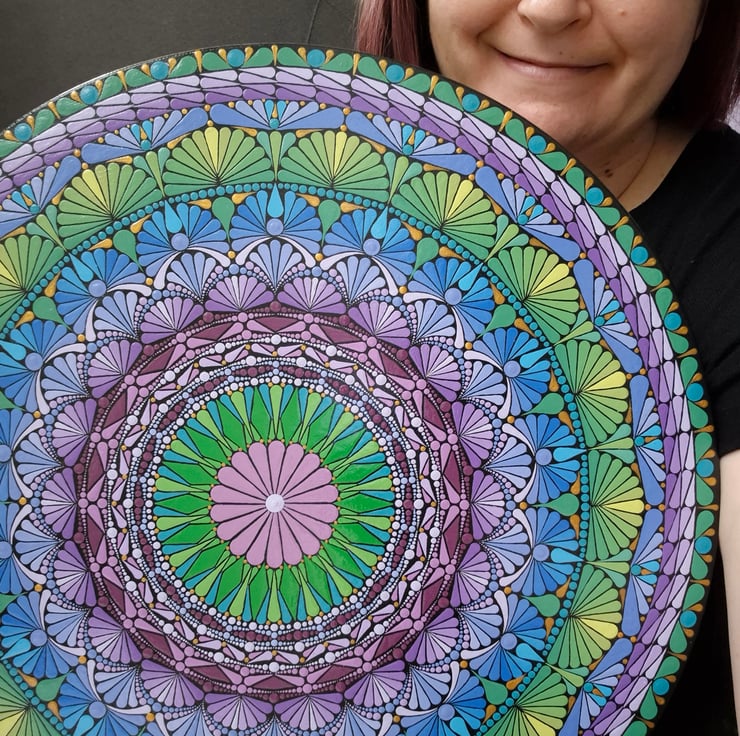 This is an original, hand painted mandala, done in acrylic paints using dotting tools and scribing tools to meticulously shape the paint. It is finished in 3 coats of a satin varnish to add a subtle shine and to give long lasting protection.