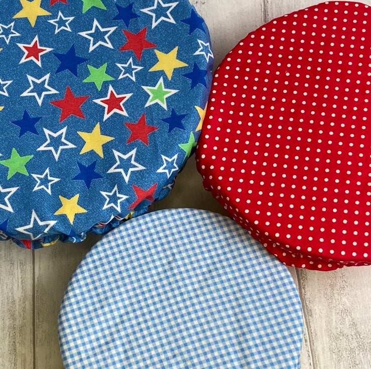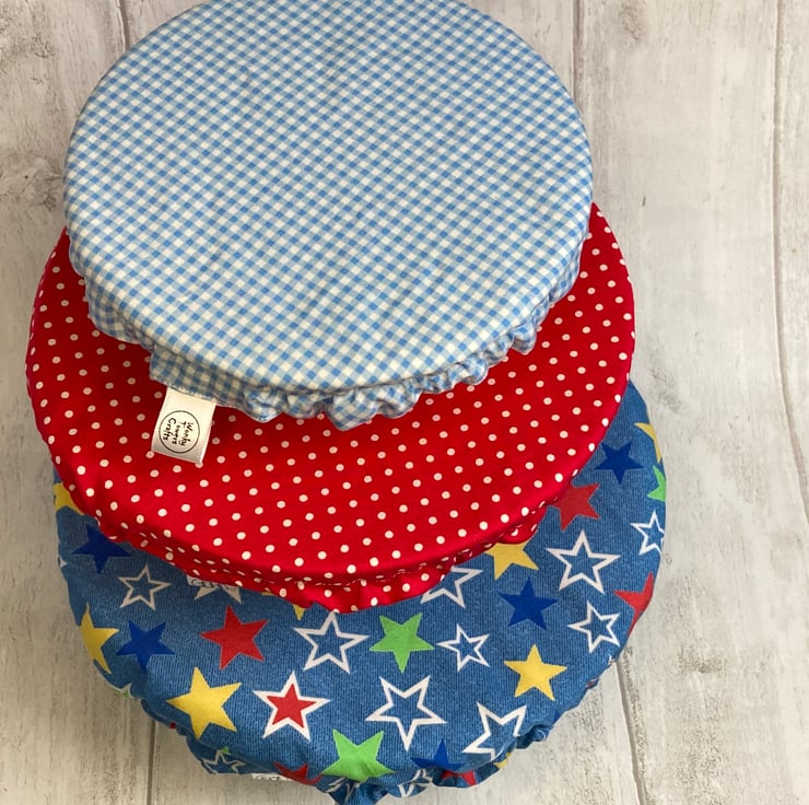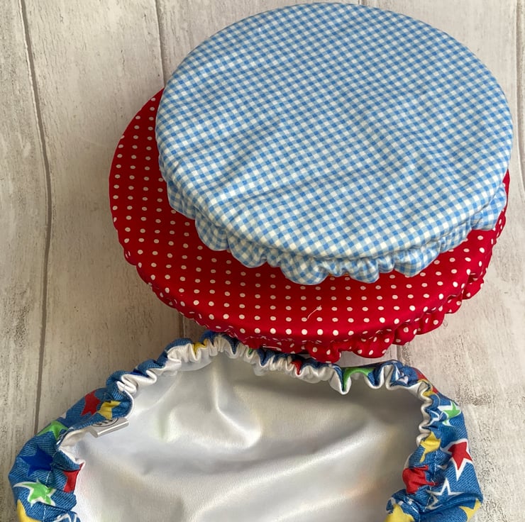 This set of 3 covers will fit bowls approximately 23cm, 19cm and 16cm (9", 7.5" and 6"). They are made from 3 coordinating cotton fabrics. The biggest cover is blue with stars in red, yellow and green. The middle size is red polka dot fabric and the smallest blue gingham. The PUL lining is white.