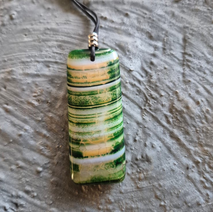 Green and yellow fire agate oblong stone on Black leather cord with stainless steel connector and slider