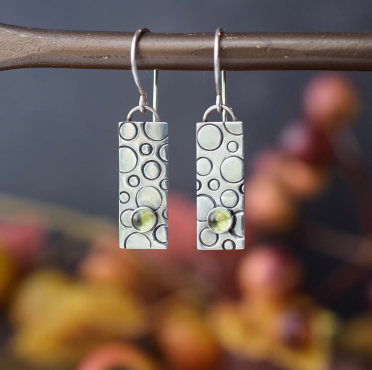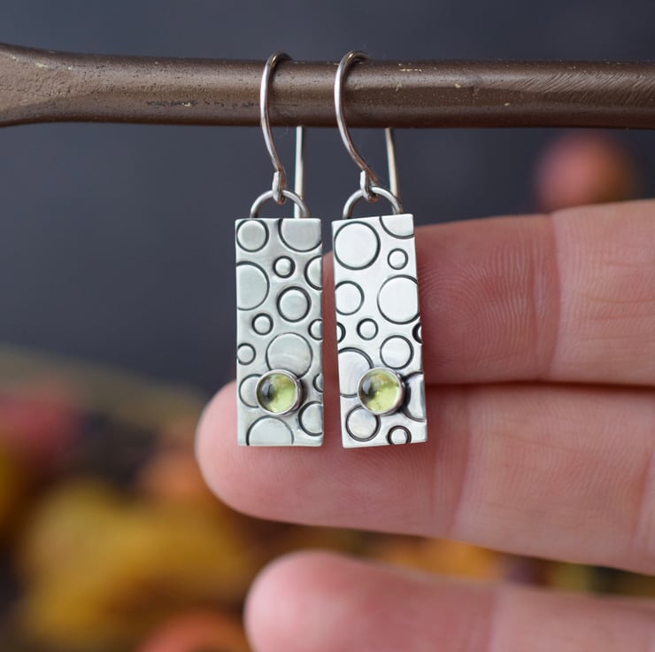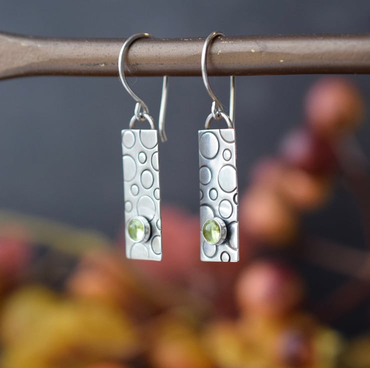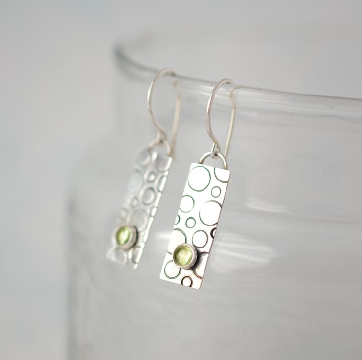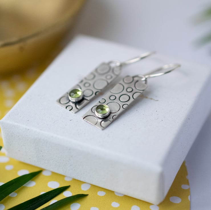Handcrafted in solid sterling silver, each earring features a hand-pierced (cut) rectangle shape which has been textured with metal stamps to create a bubble-like pattern. A 4mm peridot stone is set on the bottom of each piece to add a splash of colour, before oxidising to add depth of colour and polishing back to a shine. The design is suspended from handmade ear wires for a true artisan finish.