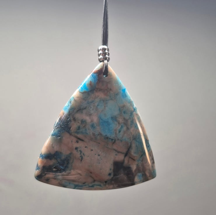 Blue crazy lace triangle pendant on black leather cord and stainless steel connector and slider