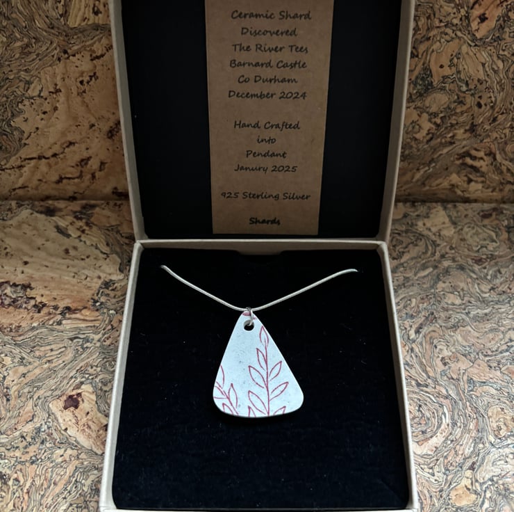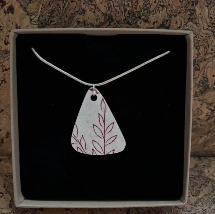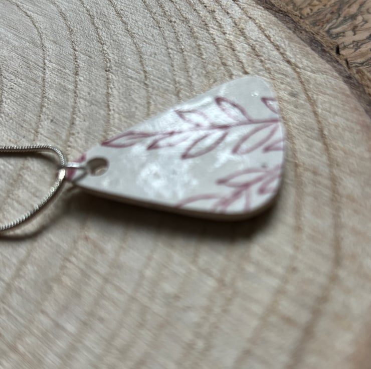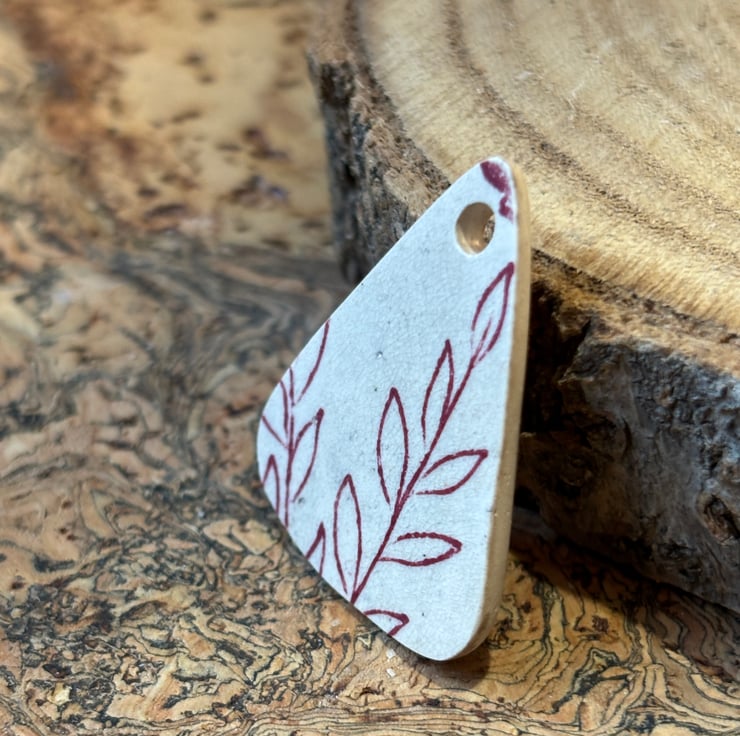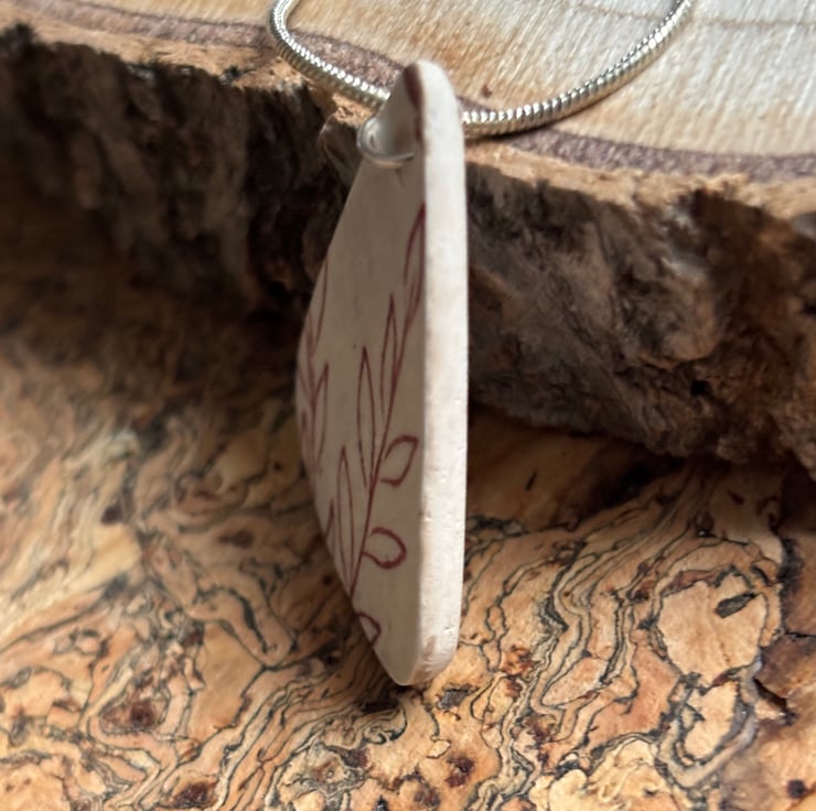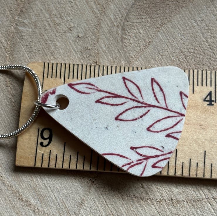 This pendant is made from one of those pieces, red outline of leaves design. I managed to drill a hole and gently clip the rough edges. This naturally created the final shape of the pendant. I’ve sanded and smoothed the edges and back. Front glaze partially in tact giving the piece a lovely shine. Irregular triangle shape highlights the pattern and adds to the overall unique design.