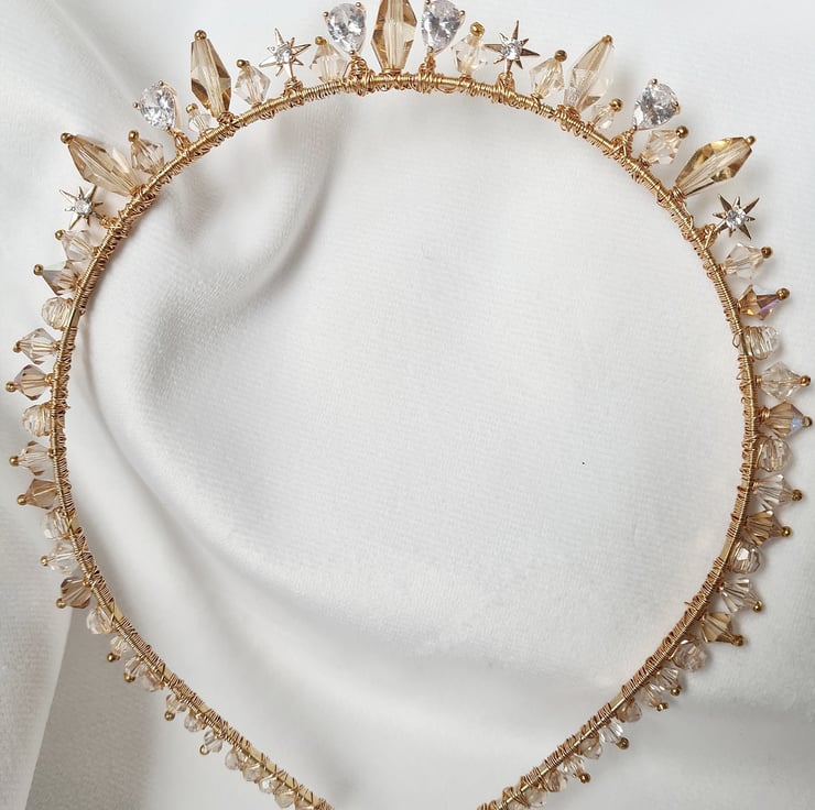 Each crystal is carefully wrapped in gold gilt wire onto a gold base, creating a luxurious and high-quality piece that is perfect for special occasions or adding a touch of glam to your everyday look. Complete with dazzling cubic zirconia charms, this headband is a must-have accessory that will surely make you stand out from the crowd.