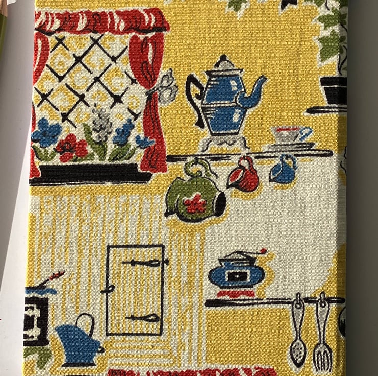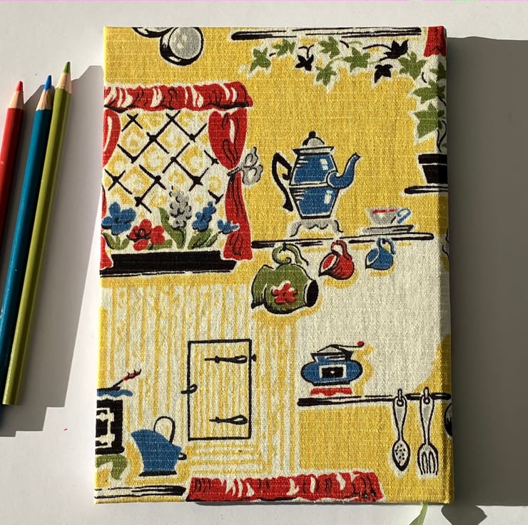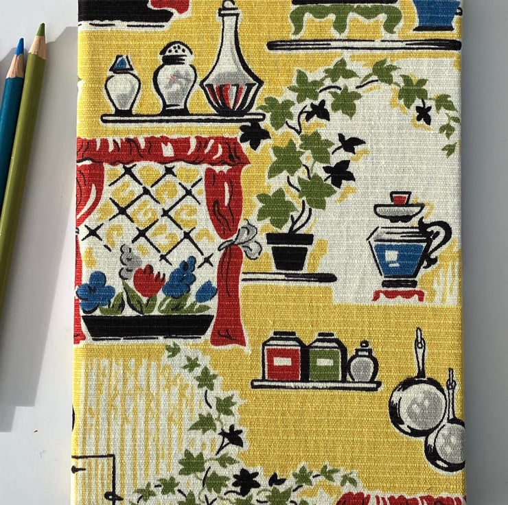Made with care from high quality 130gsm smooth white plain paper which is hand cut, folded, stitched and bound, and then covered with genuine vintage 'Kitchenalia' design fabric from the 1950's.
