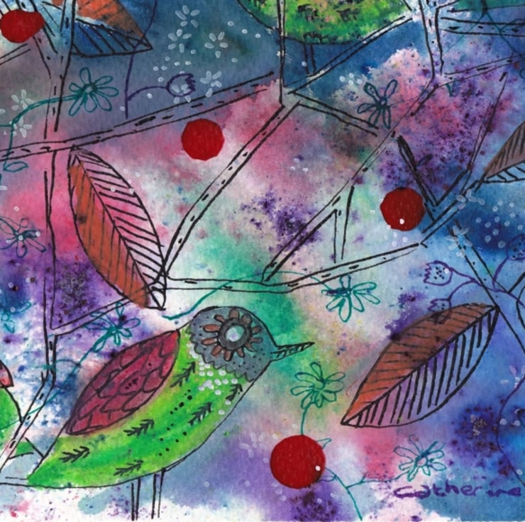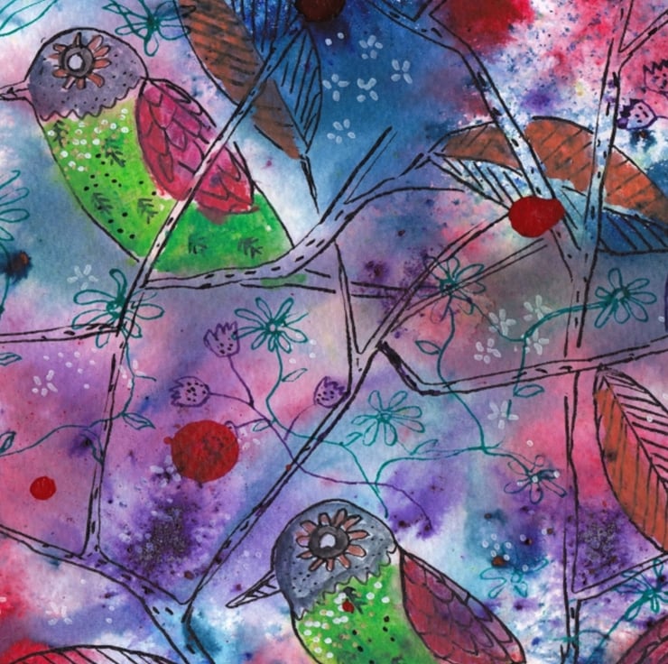 For the background I have used Brusho inks which are applied when the paper is wet so all the colours merge together. Once the paper dried I worked on top with pen and ink and applied colour to each bird.