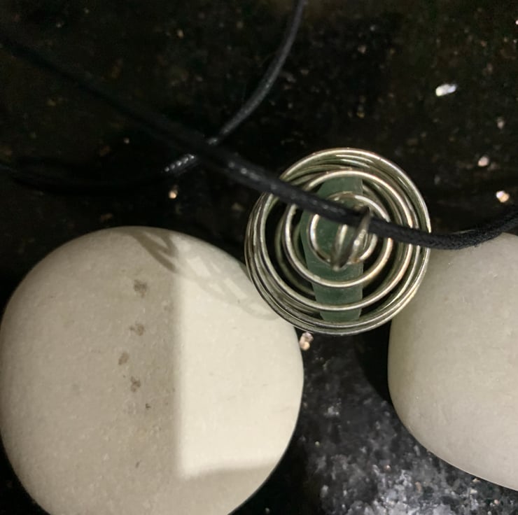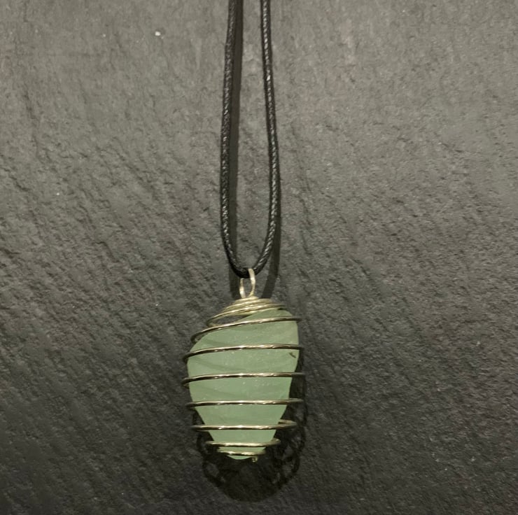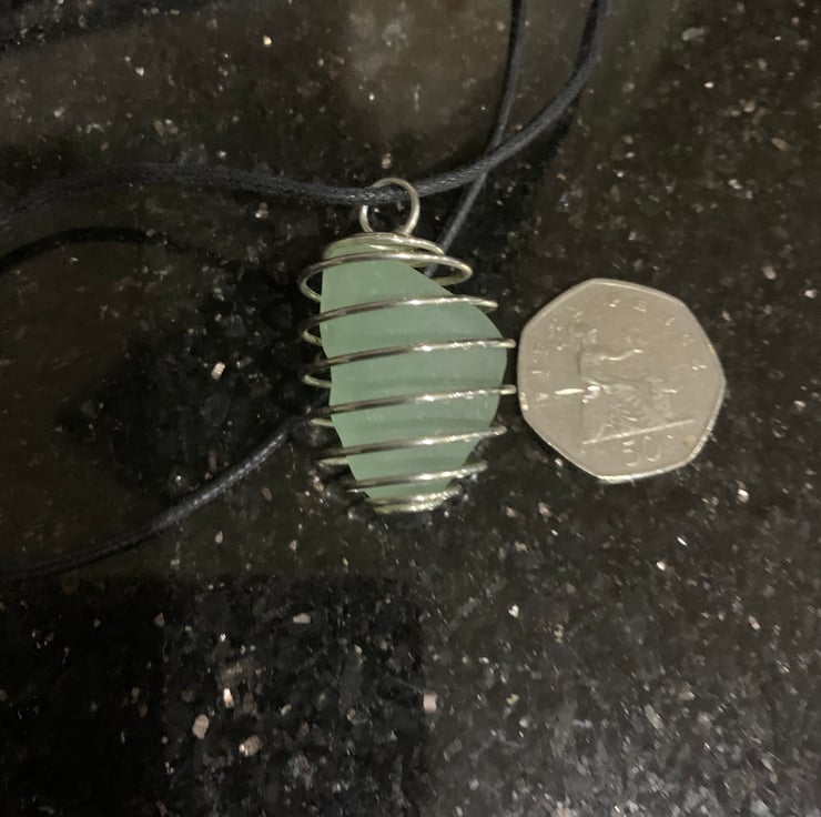 This pale blue-green piece of seaglass, collected from my local beach, is mounted in a spiral silver plated “lantern”, with a 24inch black cord and SP clasp. The lantern is approx 1.6 inch in length and is just over 3 inches in circumference at the widest part. The photos show the pendant against a 50p piece to show its relative size.