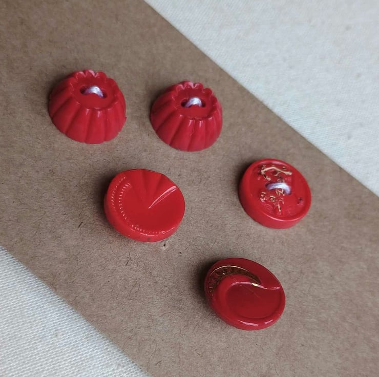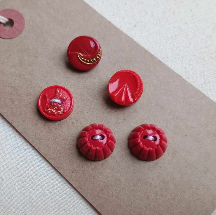 These are preloved buttons - while the plain red ones are as new, the two with coloured highlights have some wear - but they are still charming. The one with the animal motif has lost some of it's colour, and the one with the crescent moon has a nick across the centre.