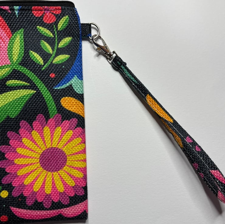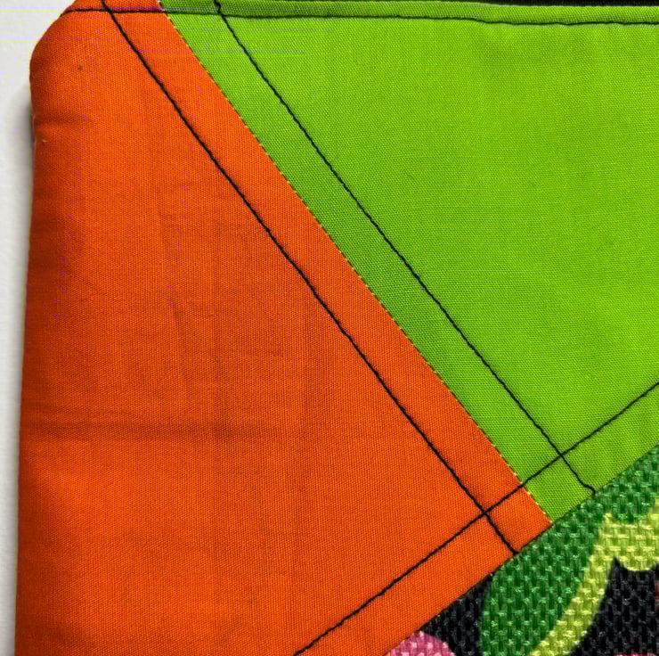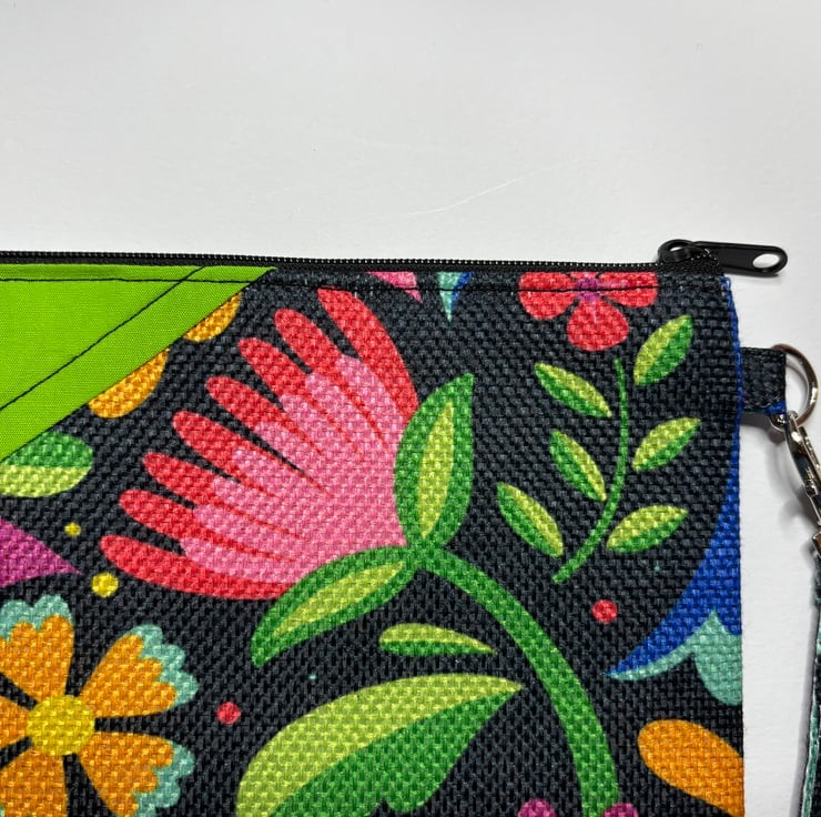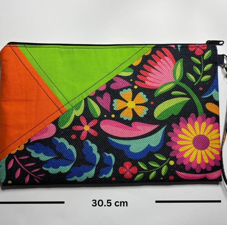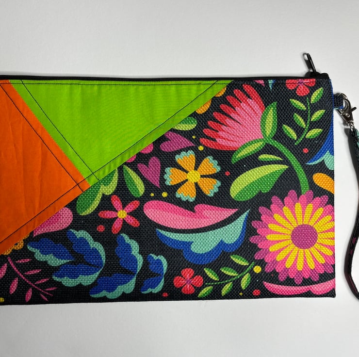 Patchwork Clutch Bag in stunning colors, Green, orange, and floral print with a black background.