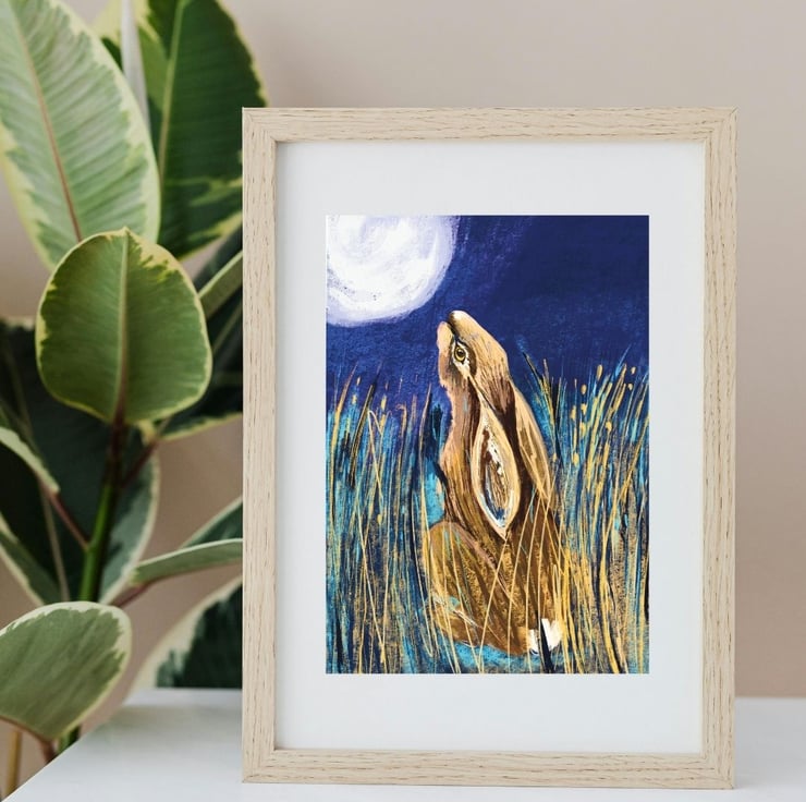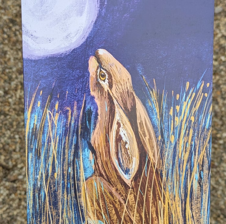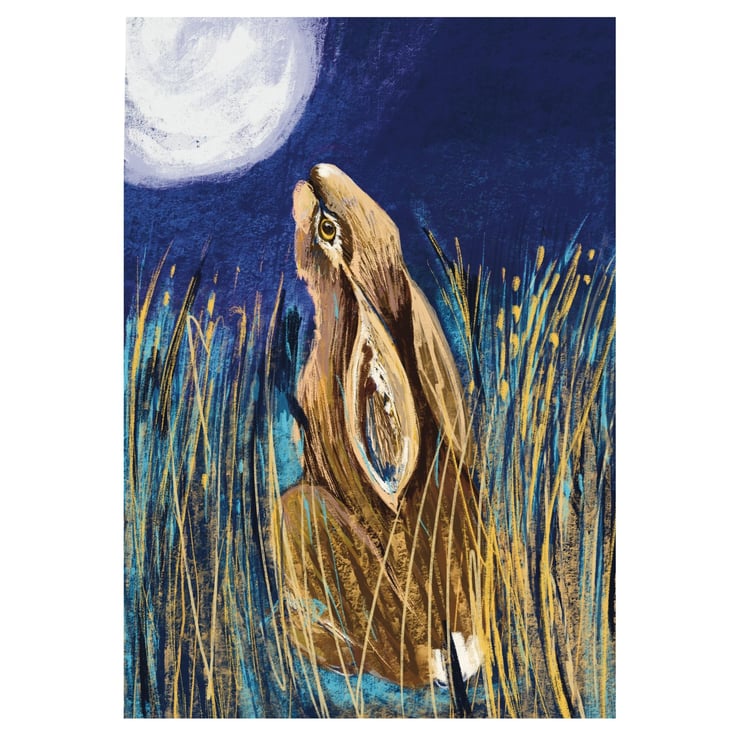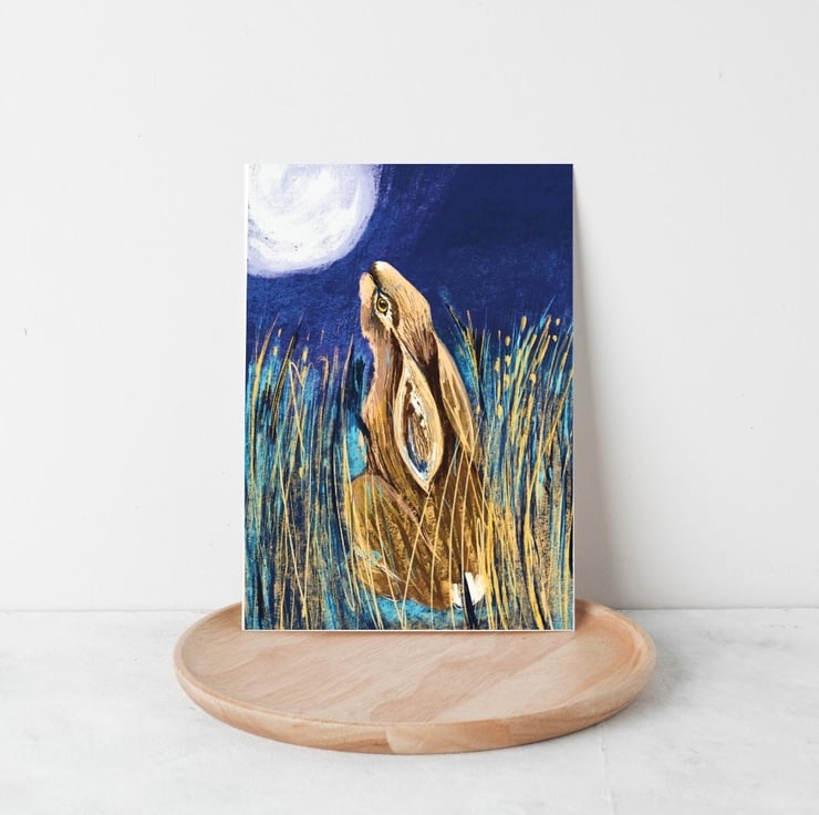 The hare sits and gazes at the moon in this vibrant card created from an original collage painting by The Hedgerow Artist. Perfect for sending out a special greeting . It is a card for all occassions and also available as a print.