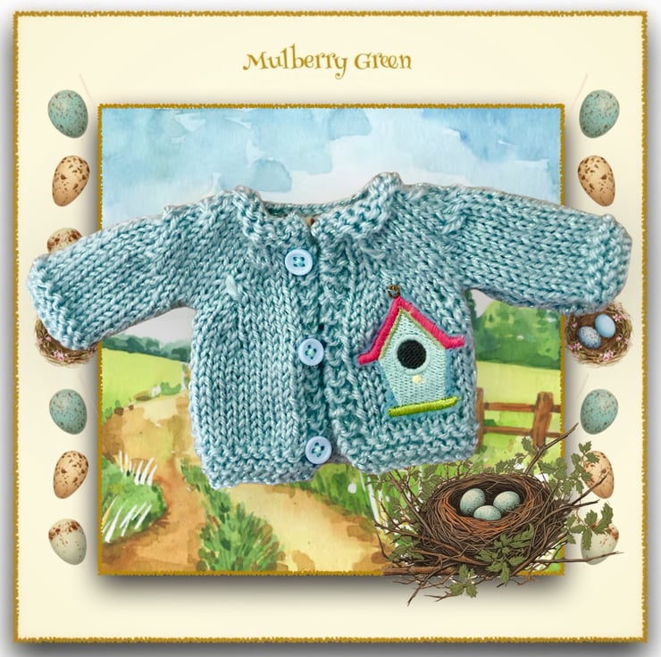 A pretty little turquoise cardigan, embroidered with a little bird house, to fit the Mulberry Green characters. The cardigan is hand knitted in sparkly acrylic yarn.