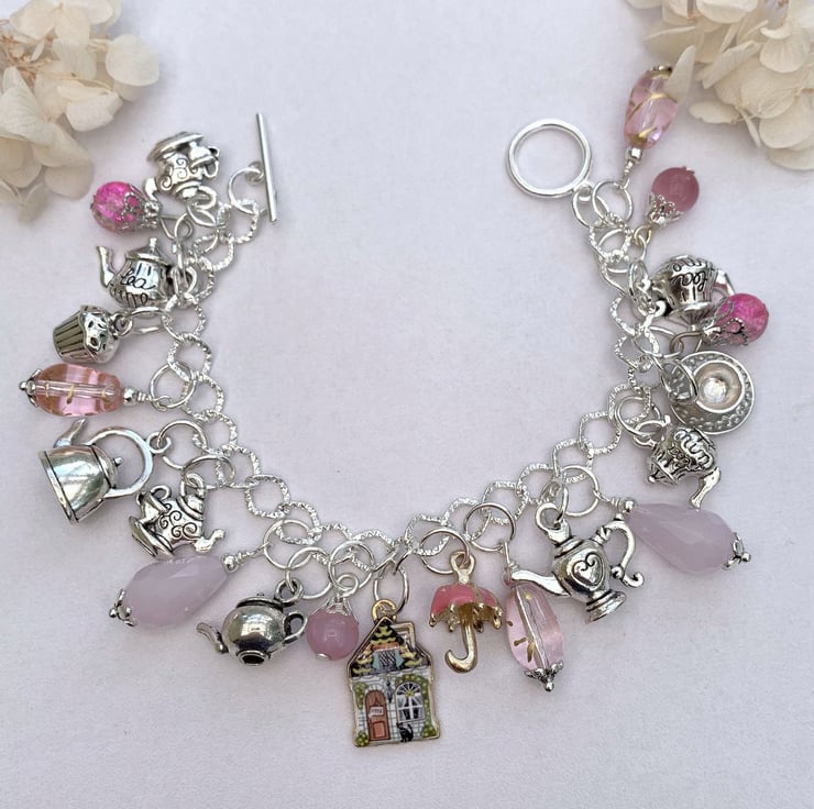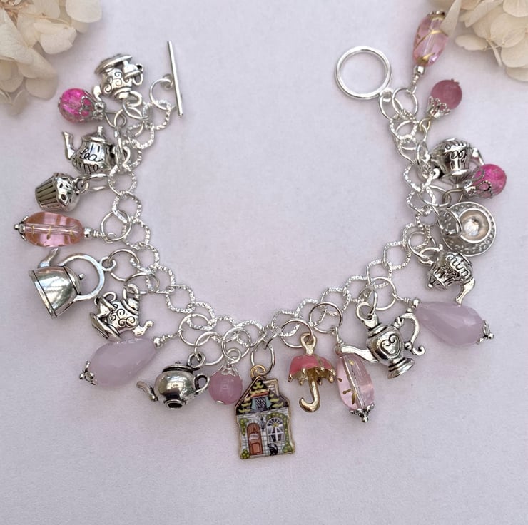 This pretty bracelet is made with a collection of different teapot and teacup silver charms mixed with pink glass drop beads and baby pink glass teardrop beads. The bracelet is finished with a toggle fastening. The finished length is 19cm including the toggle fastening.