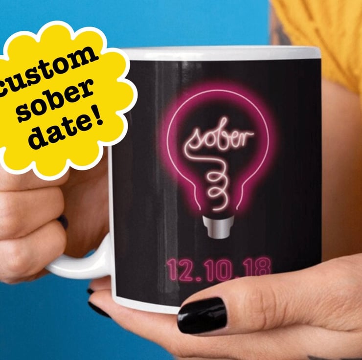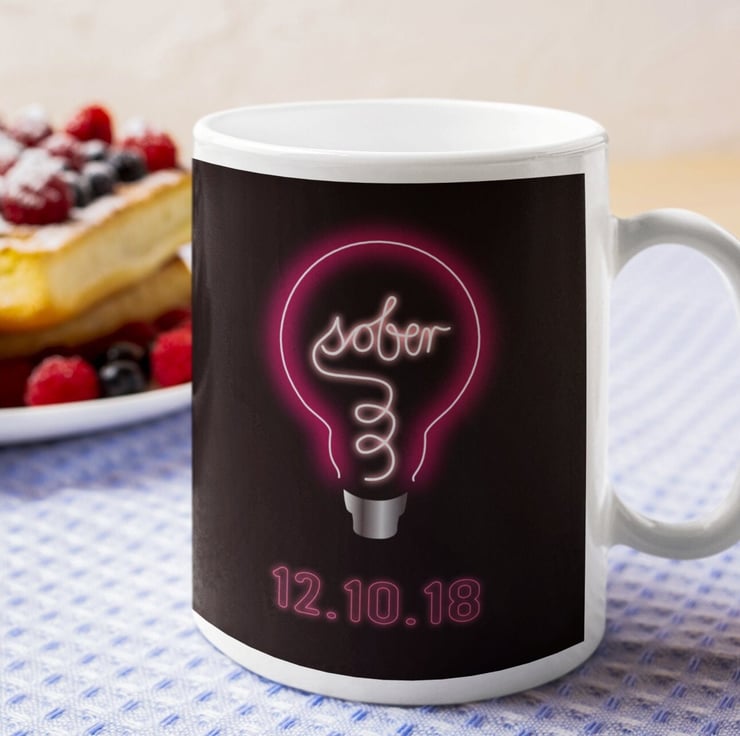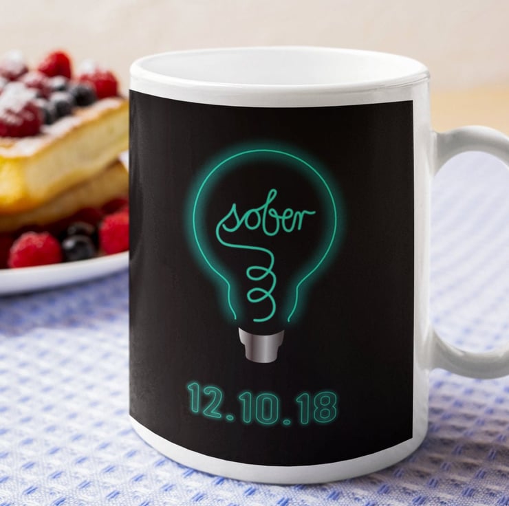 Drink to your Loving Sober lifestyle with this beautiful ceramic mug, perfect for your morning coffee, tea or a hot chocolate. This unique design celebrates that life-changing moment of clarity and features a lightbulb with a filament saying sober and can be customised with your own or your loved one s all important sobriety date...