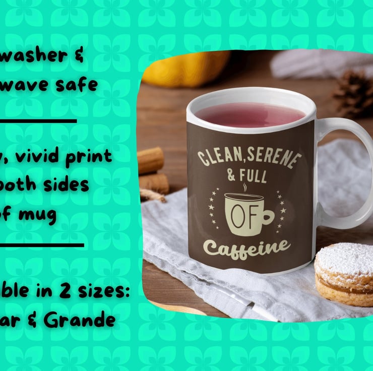 The mug is glossy white with a vivid print which retains its quality and lustre when used in both the microwave and the dishwasher.