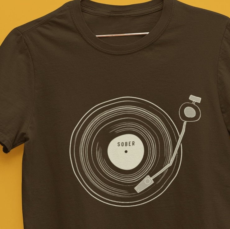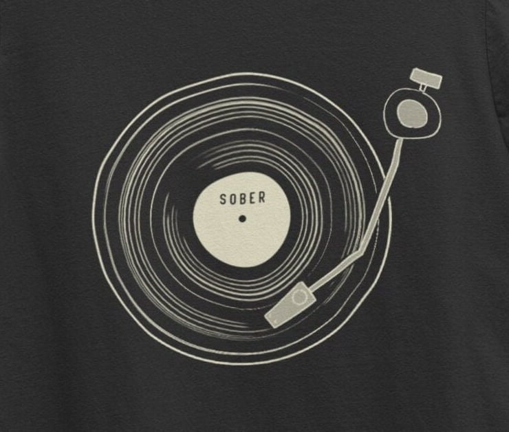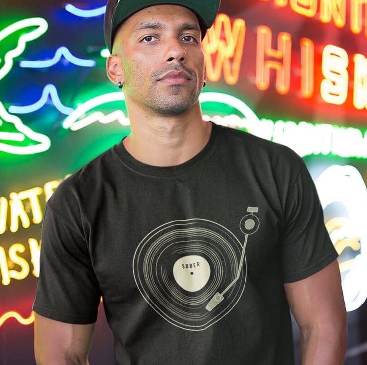 Ready to party sober? Make a stylish statement about your living sober lifestyle with this graphic unisex t-shirt featuring a hand-drawn white label disc with the word Sober in the middle.