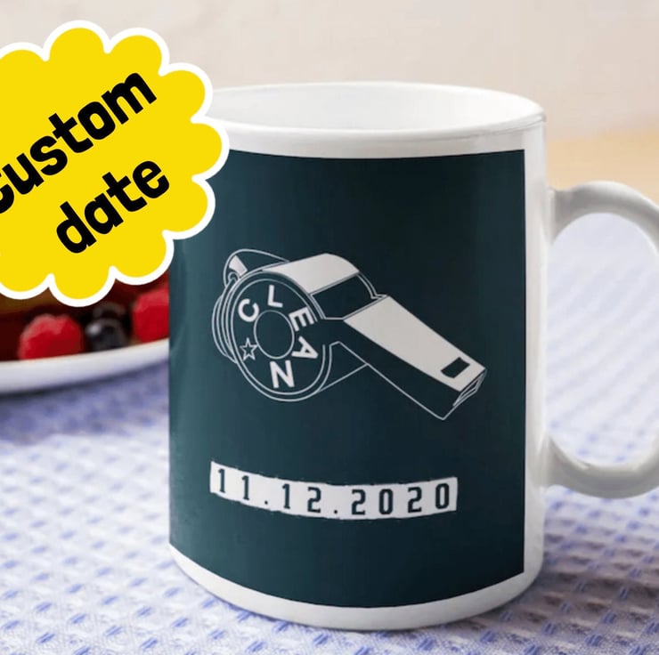 Drink to your Clean & Sober lifestyle with this beautiful ceramic mug, perfect for your morning coffee, tea or a hot chocolate. This unique graphic design features a whistle and can be customised with your own or your loved one s all important clean sober date.