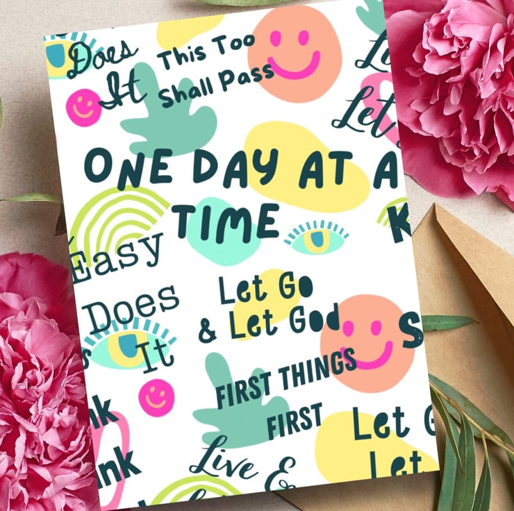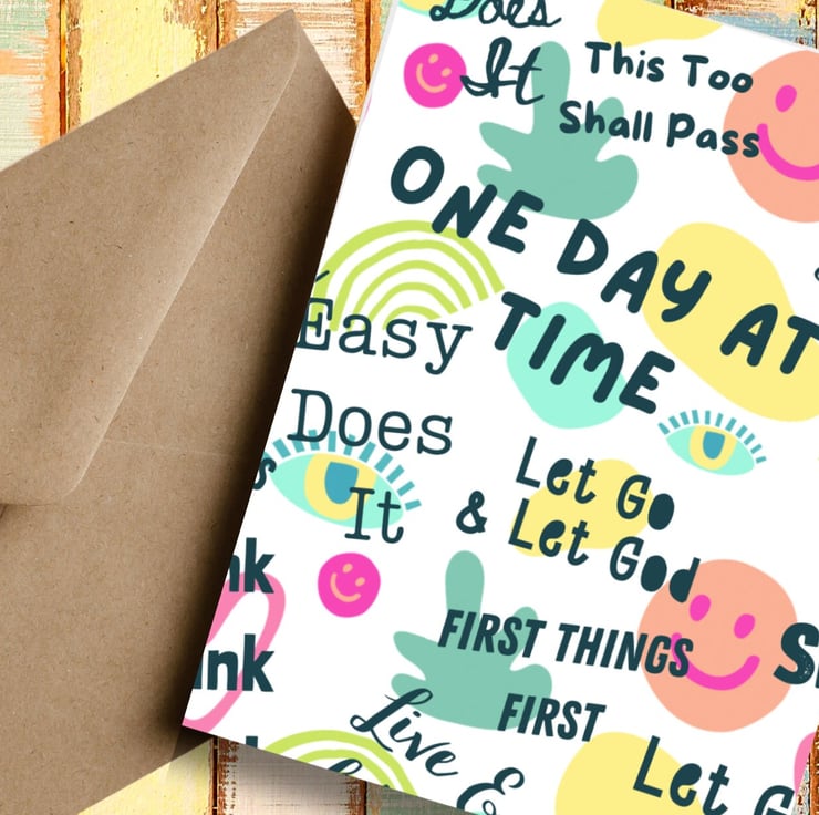 This funky sober affirmations sobriety card is guaranteed to make the Sober Star in your life feel extra special on their sober anniversary! Or the perfect card to show appreciation and encouragement to a sober friend, sponsor or sponsee. The design continue onto the back of the card.