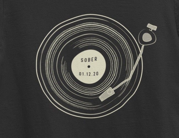 Unique hand-drawn design featuring a vinyl turntable with the word SOBER , with room for the date underneath.