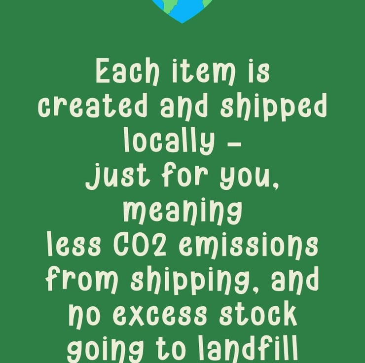 Each item is custom printed for you and shipped locally meaning both cost savings to you and less impact on the environment.