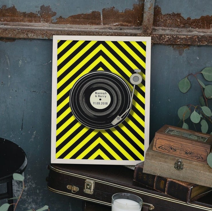 This design can be personalised in several ways, putting your own or the recipients love story in the picture and make it a truly personal piece of art. This original retro graphic design, featuring a bold yellowblack stripes pattern, will look striking as a large framed centrepiece, or as a smaller accent in a gallery wall.