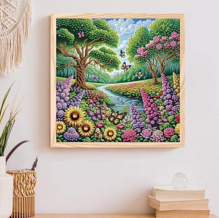 Includes 1 diamond painting, a diamond painting pen, a square of glue, a tray, and many different coloured quality diamond rhinestones. (no frame is included)