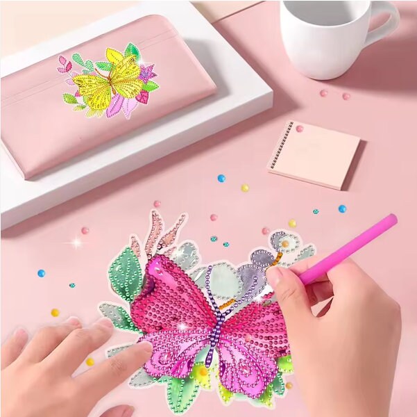 Includes 4pcs 5D DIY Assorted Colourful Butterfly Diamond Art Craft Stickers , a diamond painting pen, a square of glue, a tray, and many different coloured quality diamond rhinestones