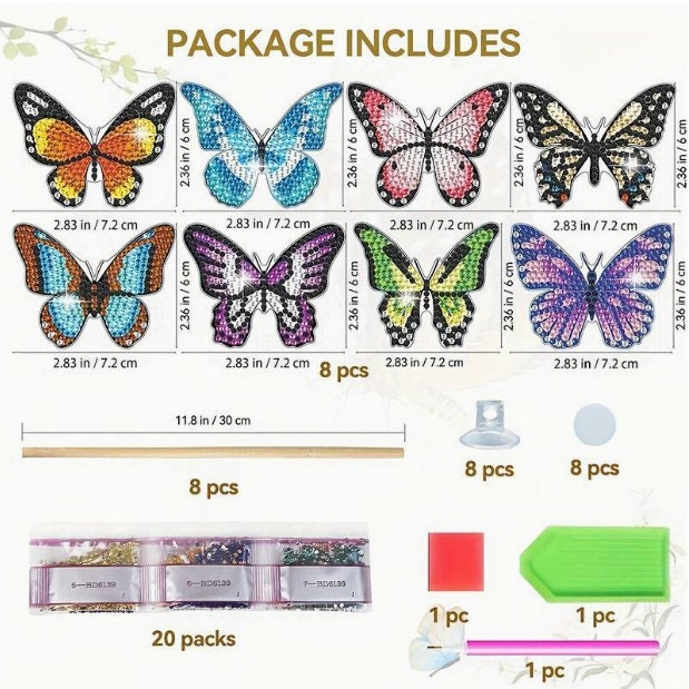 Each Pack contains 8 diamond art butterfly heads, 8 sticks, 8 attachments, 1 clay glue, 1 pen, 1 tray and a set of rhinestones.