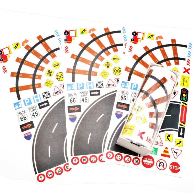 4 Sheets of traffic sign sheet 300mm x 150mm (total of 160 traffic sign stickers and 4 road corners and 4 railway corners)