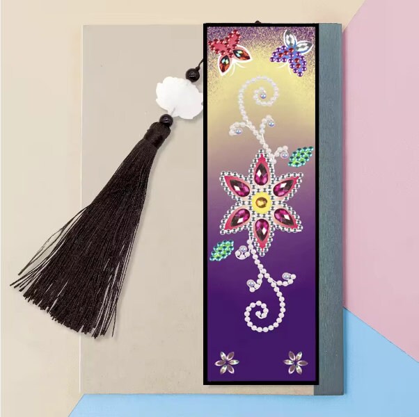 Includes 2pcs 5D DIY Colourful Butterfly and Flower Diamond Art Bookmarks templates, Bookmark tassles, a diamond painting pen, a square of glue, a tray, and many different coloured quality diamond rhinestones