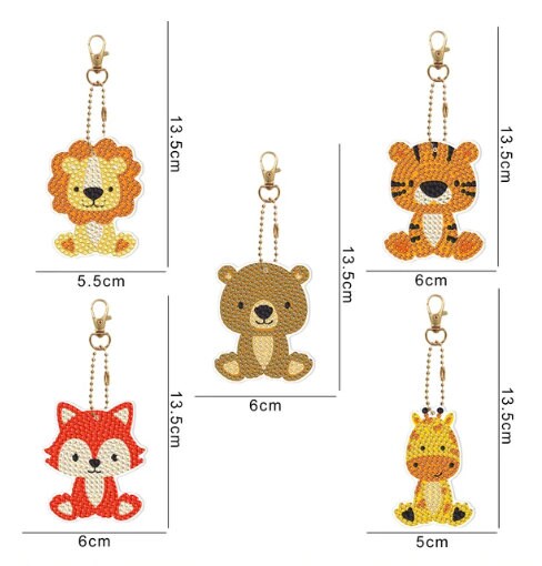 Includes 5pcs 5D DIY Assorted Cute Animal Design keyring templates, keyring chains, a diamond painting pen, a square of glue, a tray, and many different coloured quality diamond rhinestones