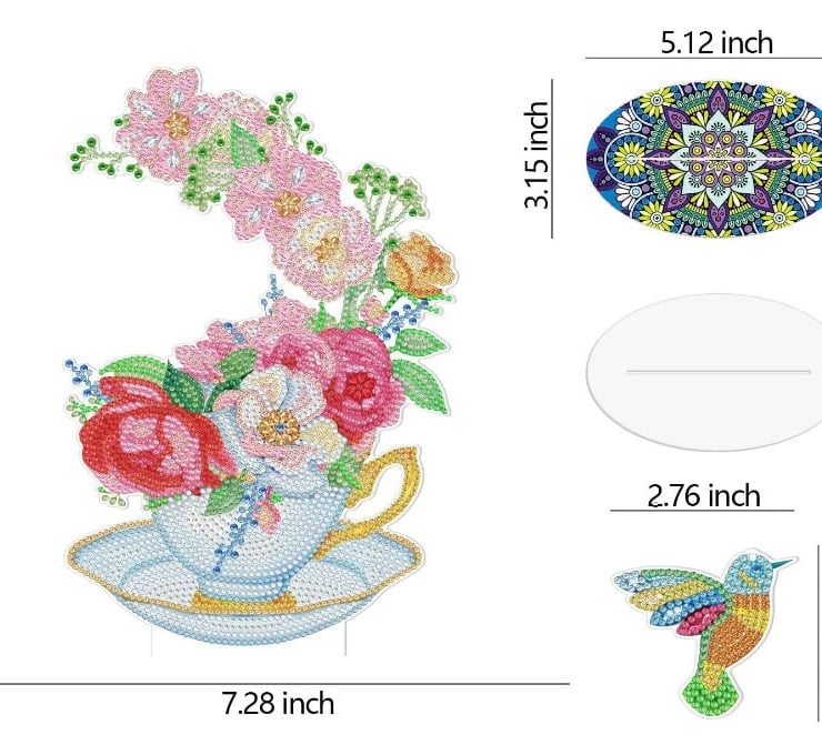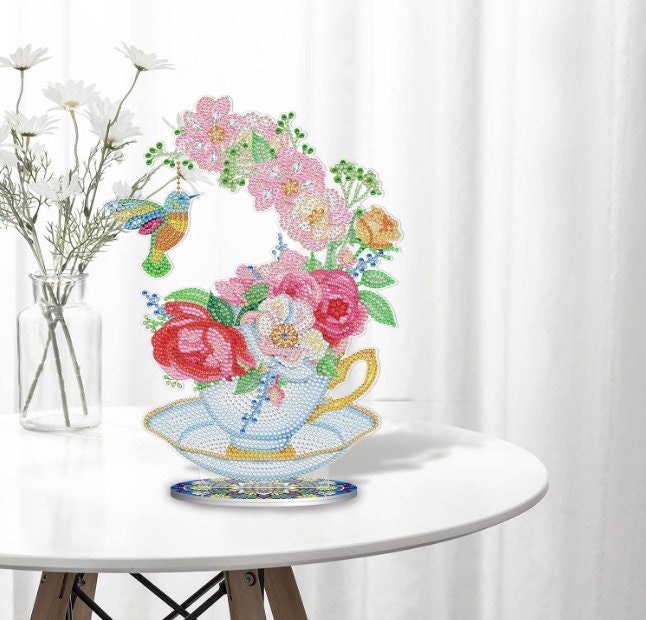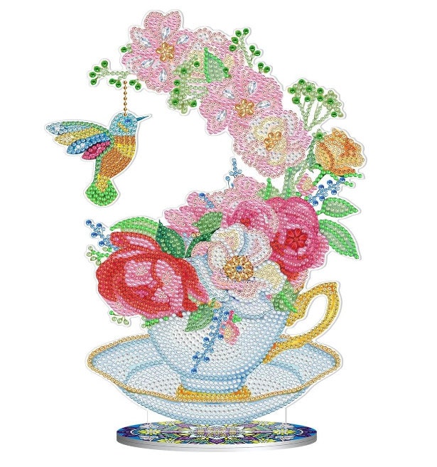 5D DIY Hummingbird in Floral Teacup Diamond Art Kit Crystal Embroidery Rhinestone Approx 11cm x 7cm Acrylic Decoration