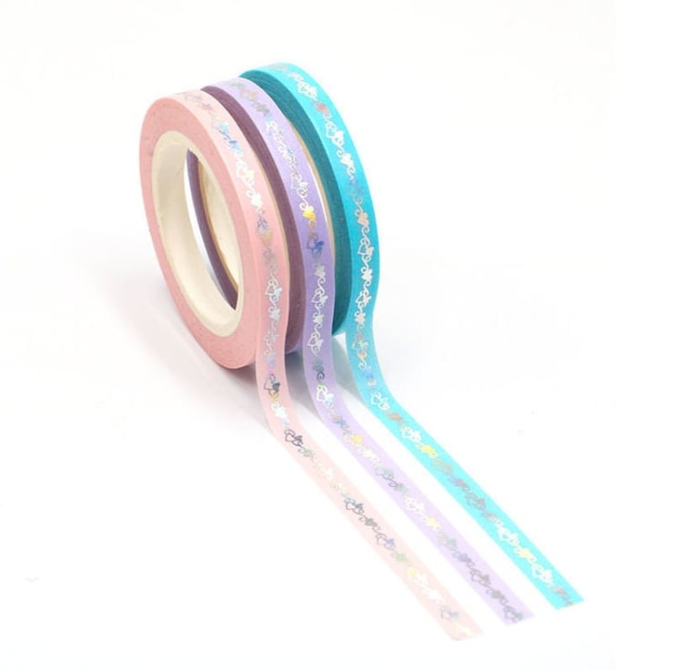 3 Rolls Skinny 5mm Love Heart Washi Tape With Holographic Silver Foil Embossing