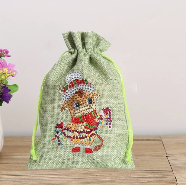 5D DIY Diamond Art Painting Christmas Reindeer Linen Gift Sack Bag DIY Rhinestone Embroidery Diamond Kit for Beginners and Gifts