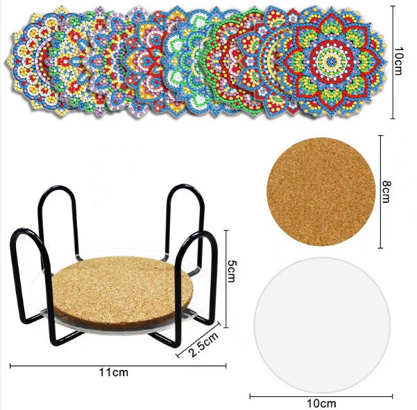 Each Pack contains 8 acrylic coasters, 8 non-slip Cork bases, 1 clay glue, 1 pen, 1 tray and a set of rhinestones. The cork base is non-slip to protect tables and the metal holder allows you to store the diamond painting coasters away together.
