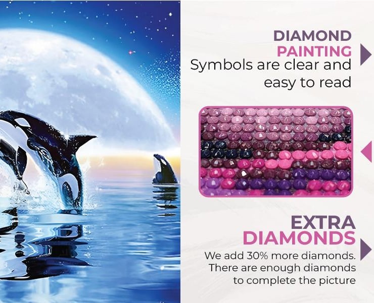 Includes 1 diamond painting, a diamond painting pen, a square of glue, a tray, and many different coloured quality diamond rhinestones