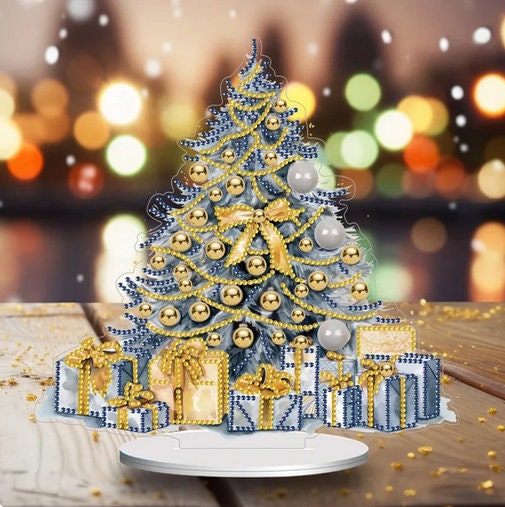 5D DIY Christmas Tree with Yellow Bow Diamond Art Kit Crystal Embroidery Rhinestone Approx 24cm x 24cm Acrylic Table Top Decoration